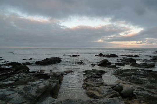 We get out of the car and walk to the beach. Someone is burning their garbage up across the road and the smoke drifts over the stretch of sand. So we continue walking on, to the slippery rocks and seaweed tendrils so long and large that they resemble kelpy octopuses. There are waves, huge waves, at the end of the rocks. Bless wants to go to the edge of the rocks to see the waves and I follow, but at the same time I am afraid. Despite my fascination with the ocean I have a deep fear of it, and the further we get from the car the more nervous I am. We are so far away from the car now that the car is a miniscule black rectangle in the distance behind us.