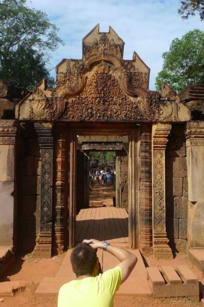 Banteay Srei is a small temple which is known for its intricate carvings. The carvings in this temple are all very meticulously done, so it’s all very pretty. Because of that it is fairly popular and there are throngs of tourists everyday: